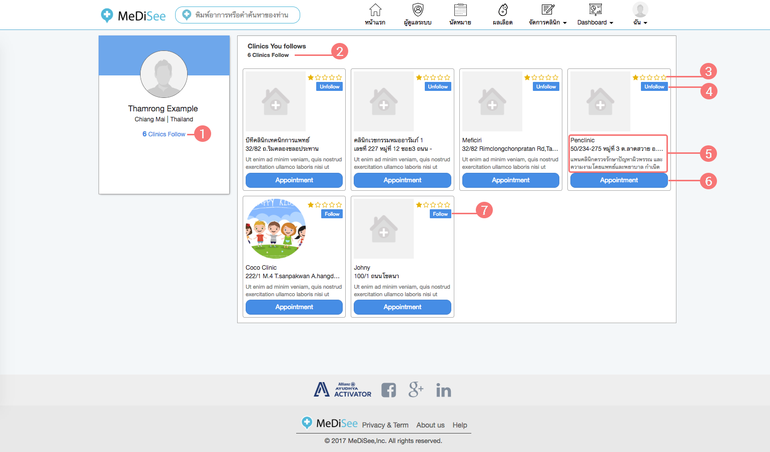 ปุ่ม "Unfollow/Follow" เมื่อไม่ต้องการติดตามคลินิกนั้นแล้วให้กดที่ปุ่ม "Unfollow"