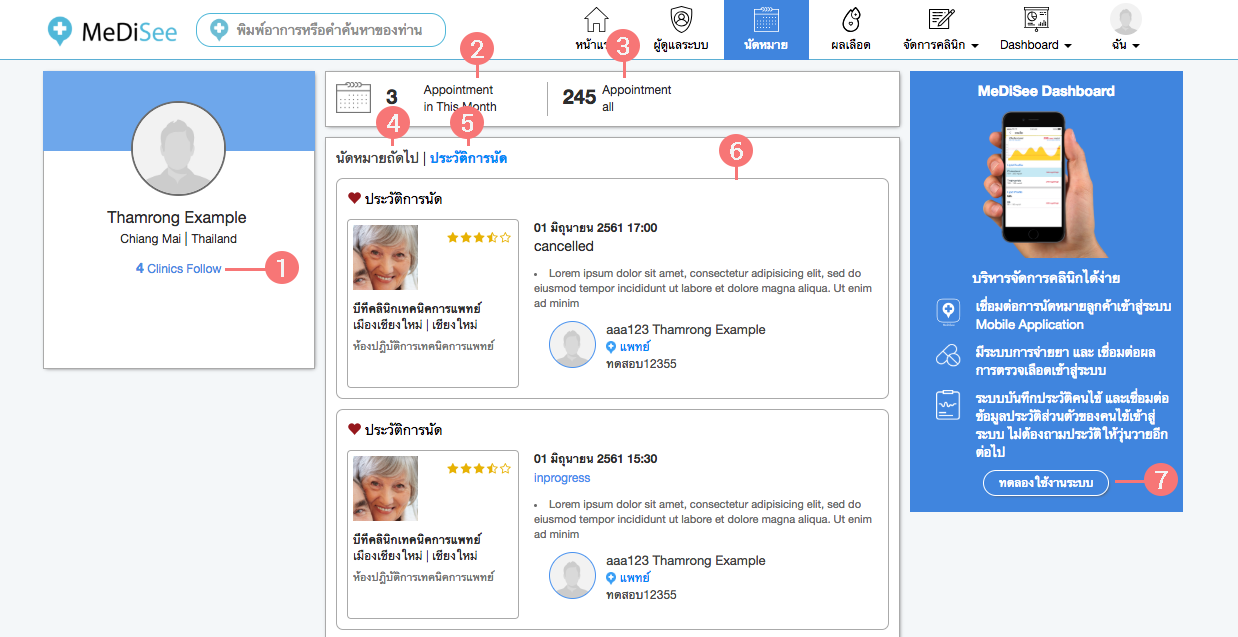 แท็บเมนู "ประวัติการนัดหม่าย" ประวัติการนัดหมายทั้งหมด