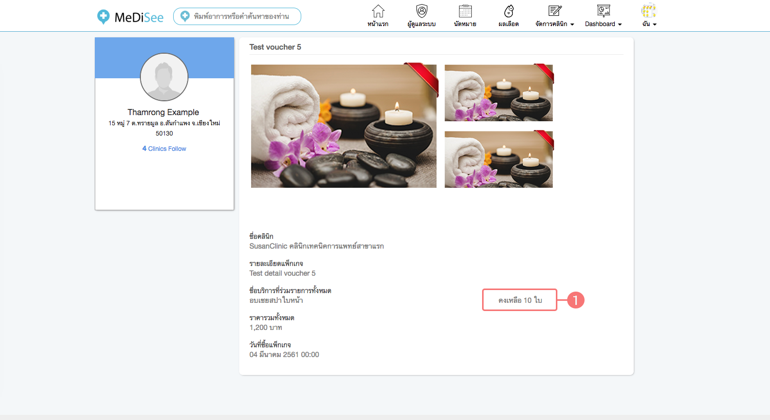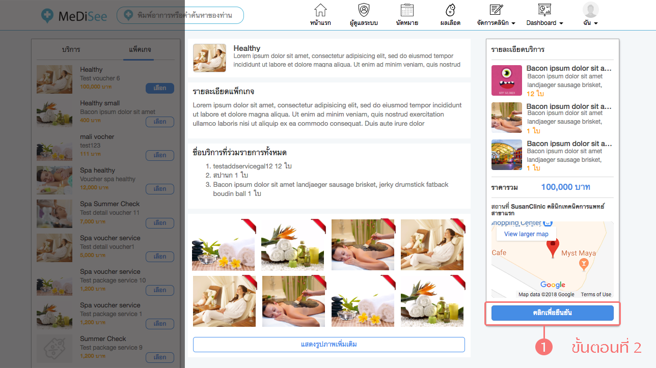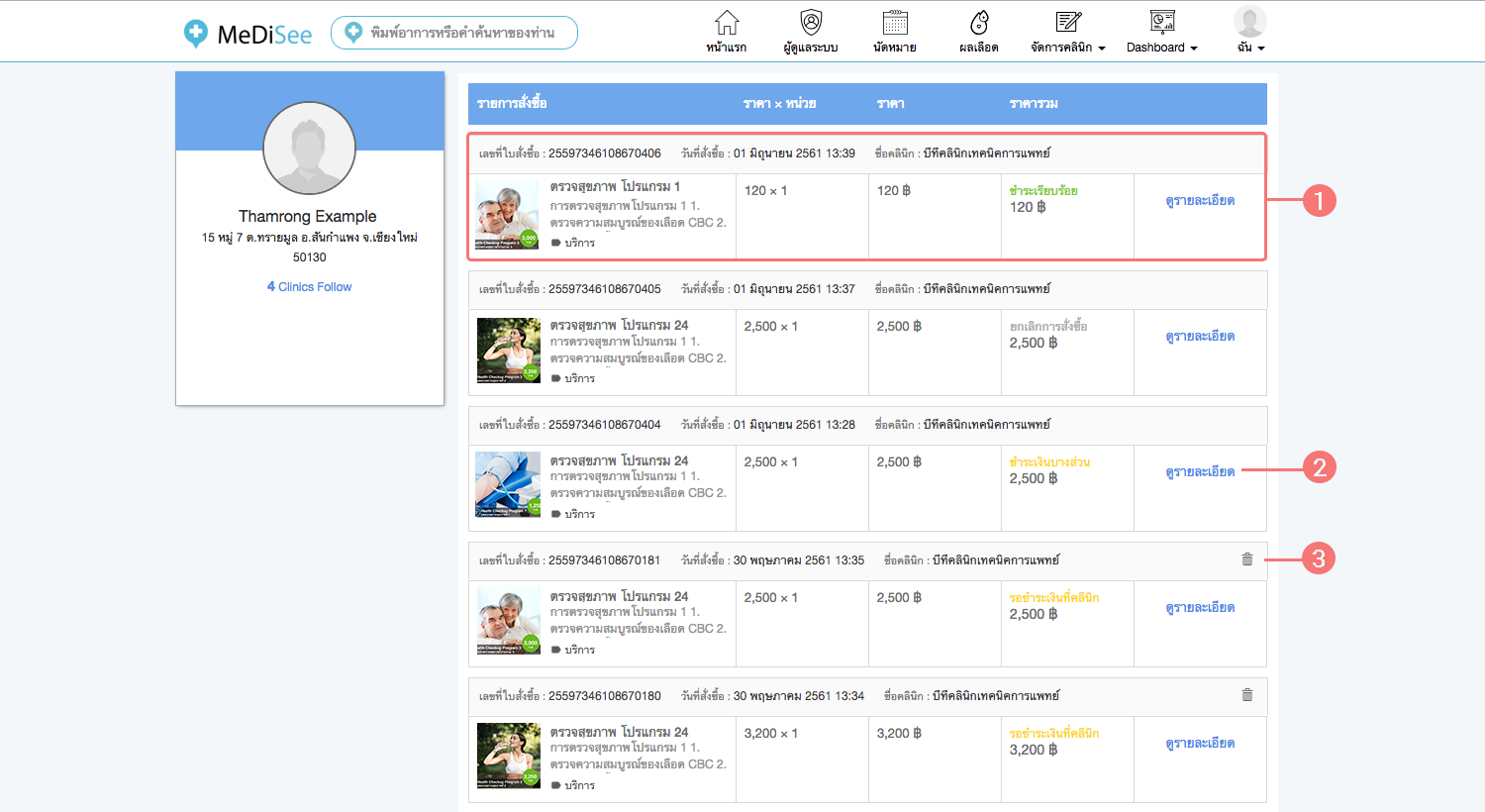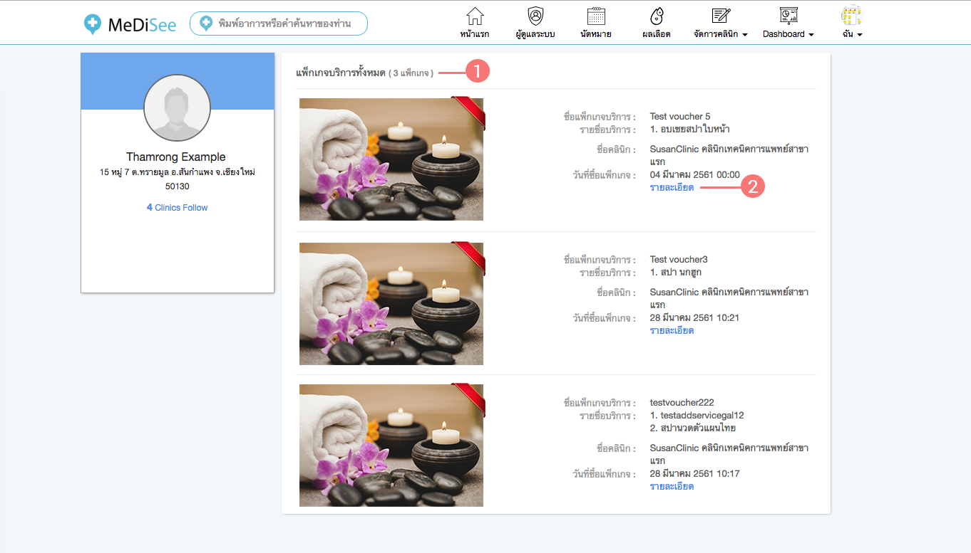 แท็บเมนู "แพ็กเกจ" รายชื่อแพ็กเกจการบริการทั้งหมดในคลินิก