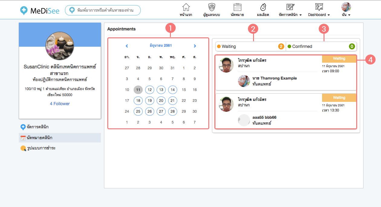 แท็บเมนูแสดงรายชื่อคนไข้ที่ทำการนัดหมายเข้ามา และคลินิกได้ "ยืนยัน" แลเว