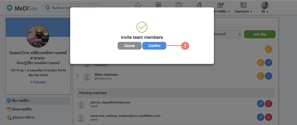 ปุ่ม "ยืนยันการส่งคำเชิญ" คำเชิญจะภูกส่งไปยังอีเมล์แพทย์เพื่อรอการตอบกลับ