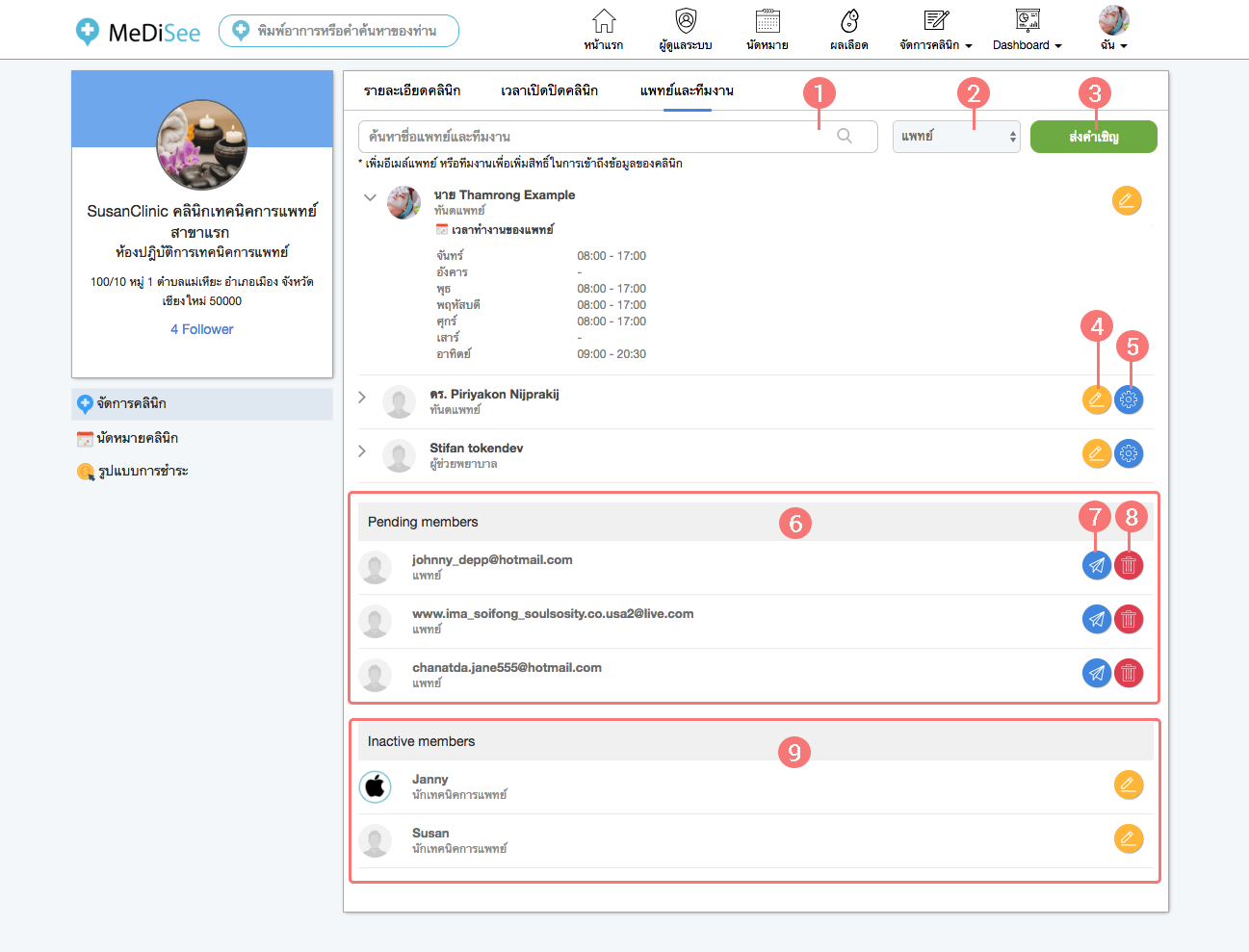 แท็บเมนู "แพทย์" แสดงจำนวน และข้อมูลเกี่ยวกับแพทย์ในคลินิก