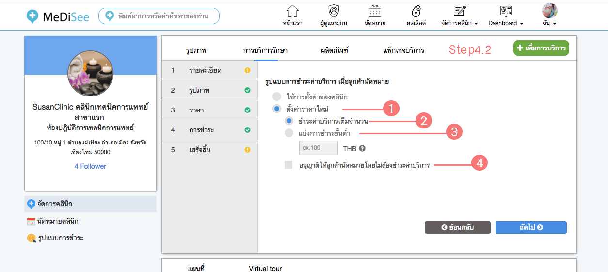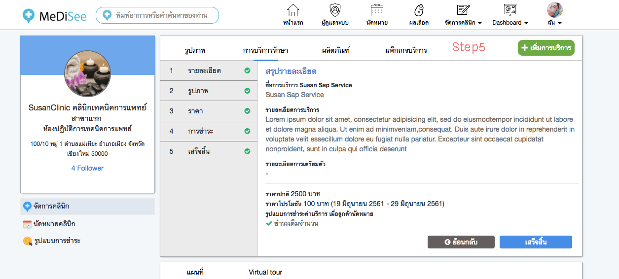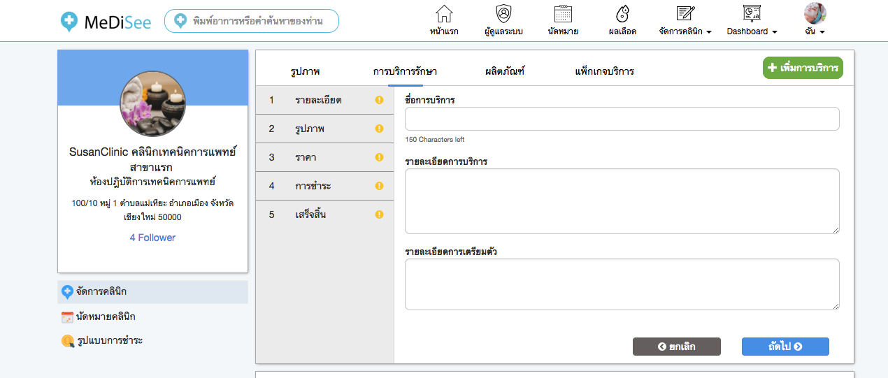 แท็บเมนู "บริการ" รายชื่อการบริการทั้งหมดในคลินิก