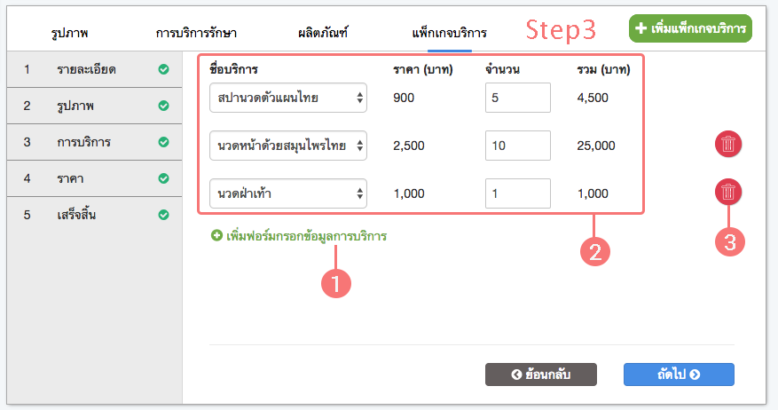 ขั้นตอนที่3 เพิ่มชื่อการบริการที่เข้าร่วมแพ็กเกจ